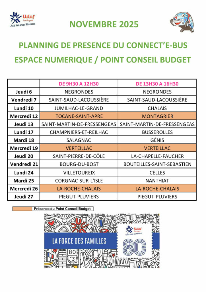 Retrouvez votre équipe Connect’e-bus dans vos communes pour ce mois de novembre. De Villetoureix en passant par Salagnac ou encore Verteillac, n’hésitez pas à venir nous voir pour tous renseignements numériques, pour une aide dans vos démarches administratives sur internet, une aide si vous rencontrez des difficultés budgétaires, ou tout simplement venir discuter avec nous.